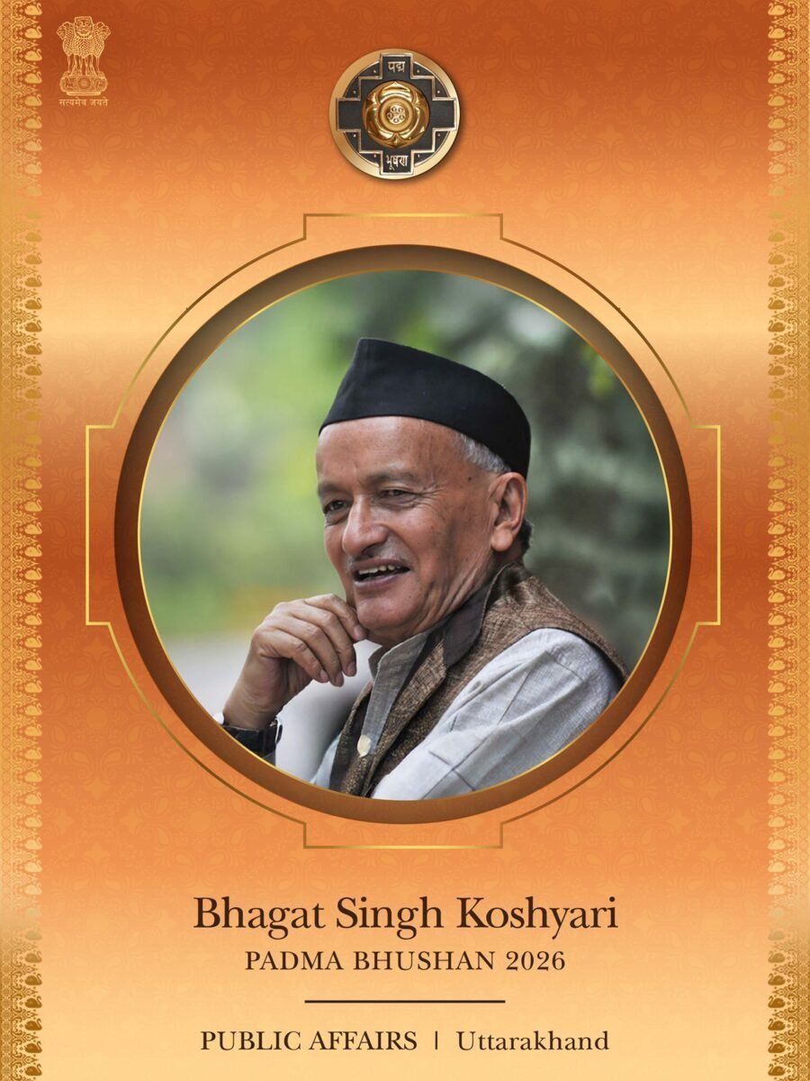 • उत्तराखंड के पूर्व सीएम भगत सिंह कोश्यारी को पद्मभूषण सम्मान से सम्मानित किया जाएगा